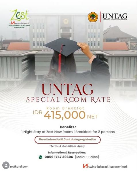 Halo, Sahabat Merah Putih! Wisuda ke-132 Untag Surabaya akan digelar pada Sabtu–Minggu, 14-15 Februari 2026. Saatnya merayakan pencapaian perjalanan akademikmu Manfaatkan fasilitas kerja sama spesial antara Untag Surabaya dan Leedon Hotel & Suites yang siap memberikan penawaran terbaik untuk berkumpul bersama keluarga Syarat & ketentuan...