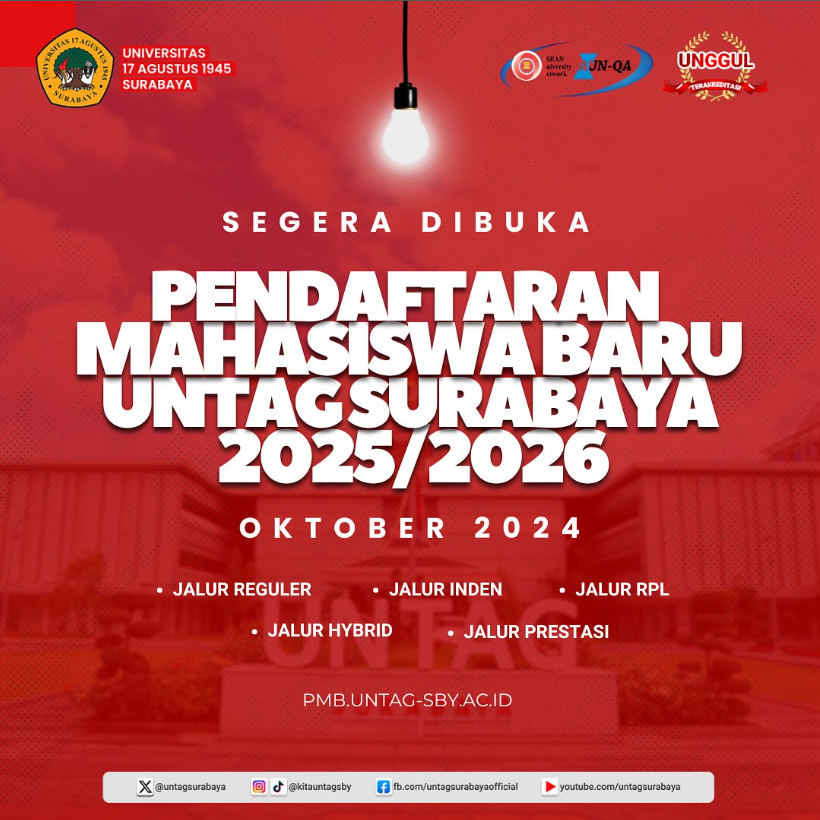Halo, Sahabat Merah Putih! Masih bingung pilih Perguruan Tinggi untuk lanjut studi? Nggak perlu bingung, Untag Surabaya pilihan tepat untuk masa depanmu. Penerimaan Mahasiswa akan segera dibuka pada 1 Oktober 2024. Persiapkan dirimu untuk mendaftarkan diri di program studi impian Dapatkan potongan DPP hingga 100%. S&K berlaku. Kami tunggu di Kampus Merah Putih...