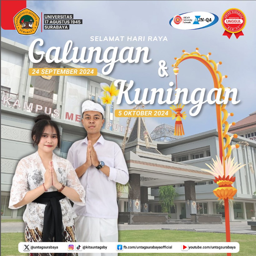 Segenap civitas akademika Universitas 17 Agustus 1945 Surabaya mengucapkan Selamat Memperingati Hari Raya Galungan dan Kuningan 2024 Di hari yang suci ini, mari kita merayakan kemenangan dharma atas adharma. Semoga semangat persatuan dan kebersamaan selalu mengalir dalam setiap langkah kita. Marilah kita renungkan nilai-nilai kebaikan dan saling mendukung, serta berbagi berkah dengan...