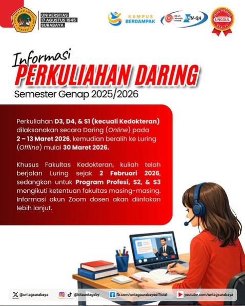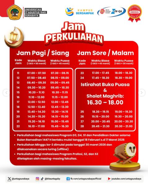 Halo, Sahabat Merah Putih! Selama bulan suci Ramadan 1447 H, Untag Surabaya melakukan penyesuaian jam perkuliahan dan jam kerja bagi mahasiswa, dosen, serta tenaga kependidikan. Penyesuaian ini berlaku mulai 18 Februari hingga 17 Maret 2026. Yuk simak perubahan jam perkuliahan dan jam kerja pada poster berikut agar aktivitas selama Ramadan tetap berjalan lancar dan...