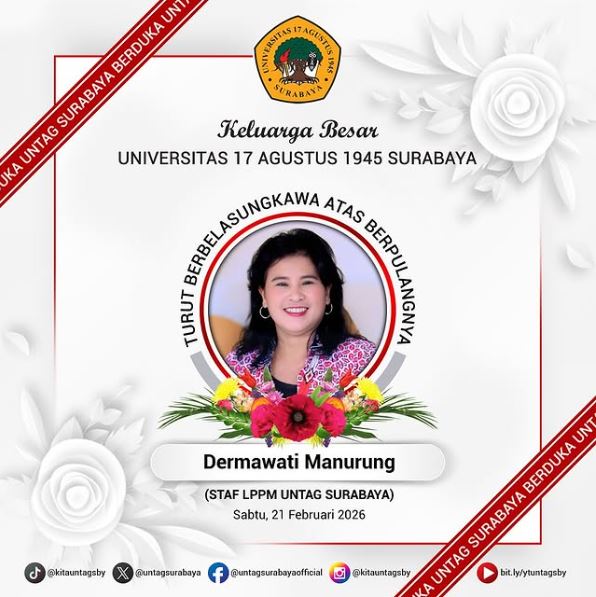 Universitas 17 Agustus 1945 (Untag) Surabaya berduka Sabtu, (21/1), Staff Lembaga Penelitian dan Pengabdian Masyarakat (LPPM) Untag Surabaya - Ibu Dermawati Manurung, berpulang. Selamat jalan ke rumah Bapa di surga, Ibu Wati. Terima kasih atas ilmu, pengabdian, kebersamaan dan kerja kerasnya. Kami, civitas akademika Untag Surabaya akan meneruskan pengabdian kita hingga akhir masa...