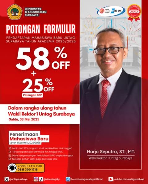 Selamat ulang tahun untuk Wakil Rektor I Untag Surabaya - Harjo Seputro, ST., MT. Berbagi kebahagiaan dalam rangka memperingati Hari Ulang Tahun Pak Harjo sekaligus Jumat Berkah, dapatkan diskon 58% untuk Formulir Pendaftaran dan diskon DPP 25%. Catat tanggalnya ya! Diskon formulir berlaku hanya hari Sabtu, 3 Mei 2025 Tunggu apa lagi? Segera klaim Formulir Pendaftaranmu secara online dengan...